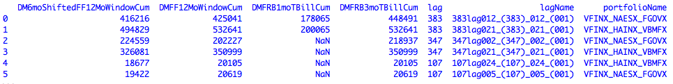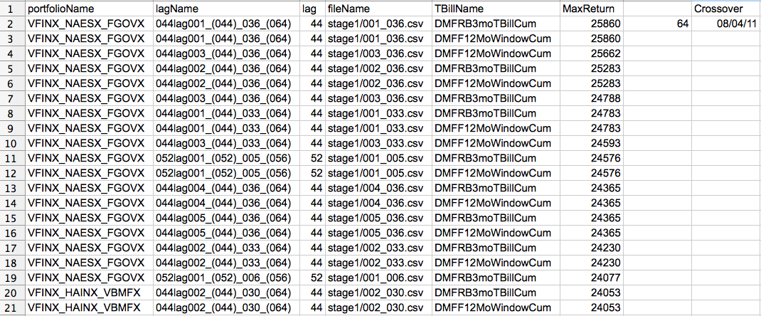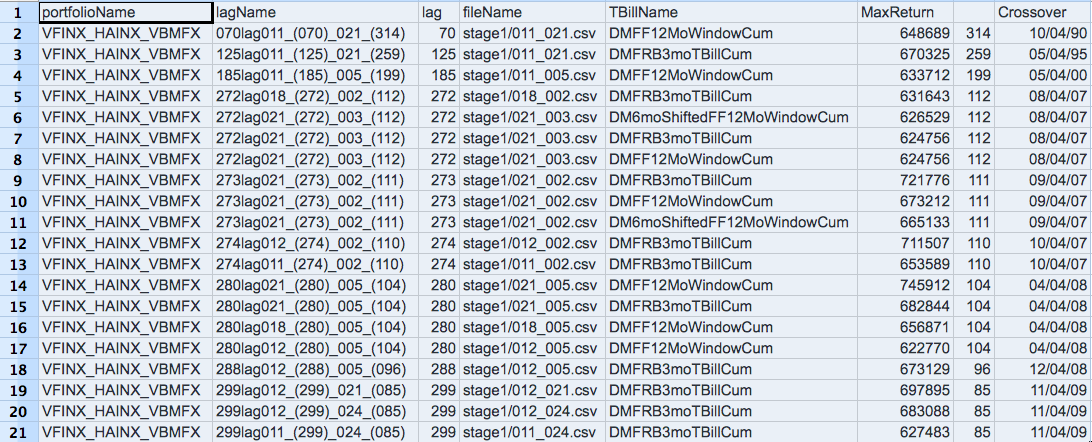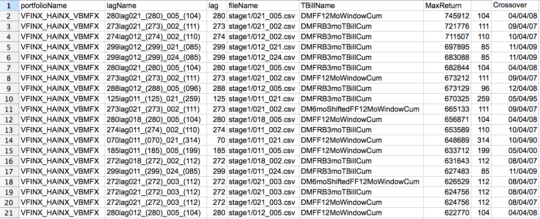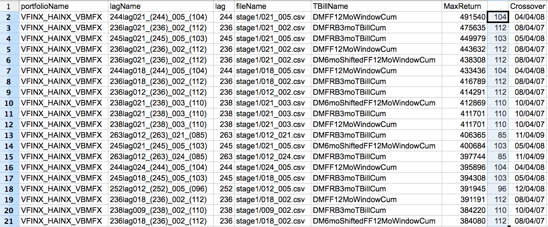 The search algorithm passes the DM algorithm a "lag structure" that starts and ends with any of Portfoliovisualizer.com’s 20 lags and switches once during the 384 month period. Below is a list of the top 20 best returns sorted by return for these 1,228,800 combinations (20 lags x 20 lags x 384 months x 2 portfolios x 4 TBill Rates).