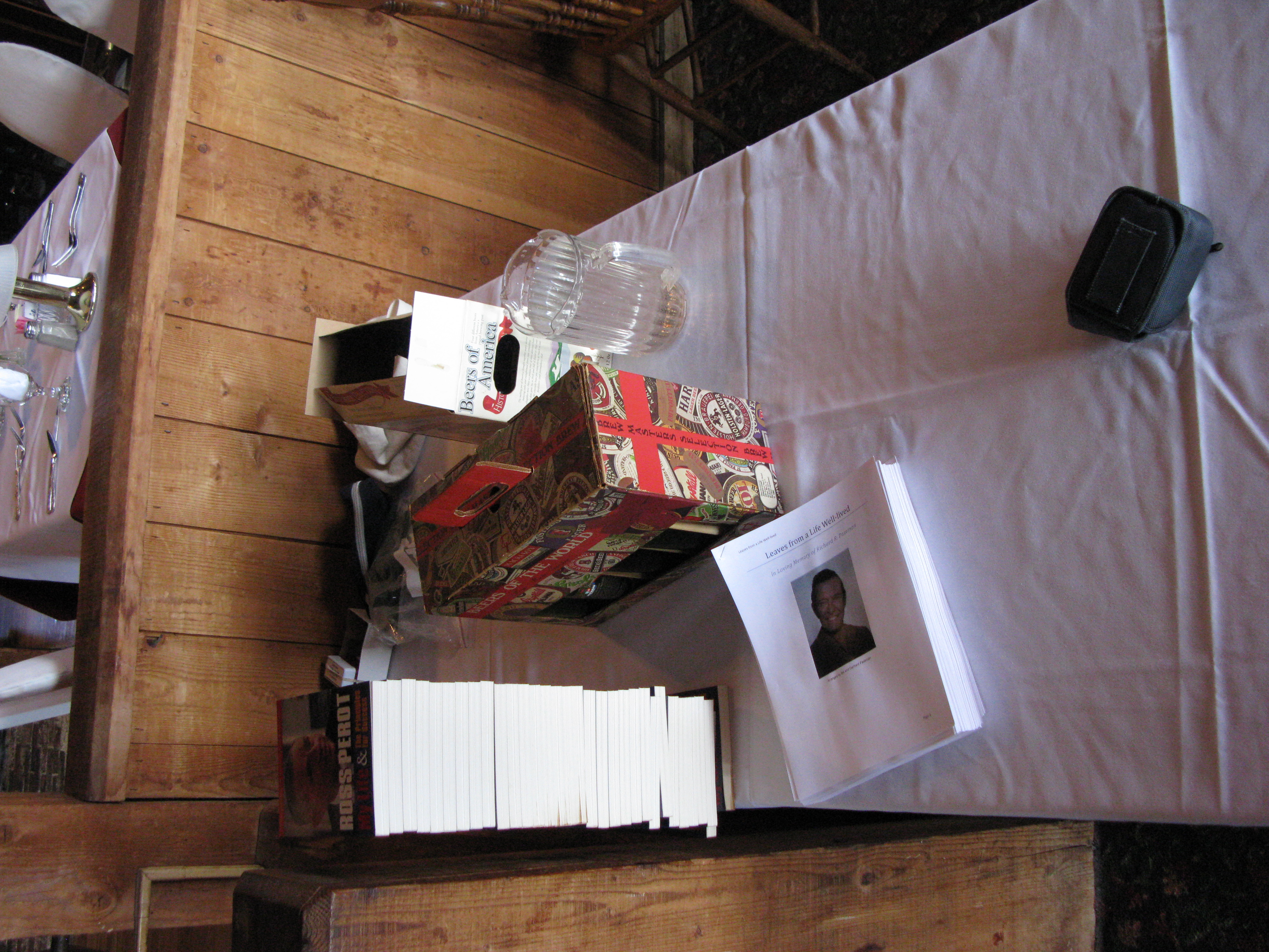 Often, when my father would visit someone in the hospital, he would spray paint a beer bottle and put in a flower, so every table had a beer bottle with a rose. Gerhard and I made a (56 megabyte) Memorial Handout for the occasion. Also, we brought Dad's two cases of H. Ross Perot books to give to the attendees.